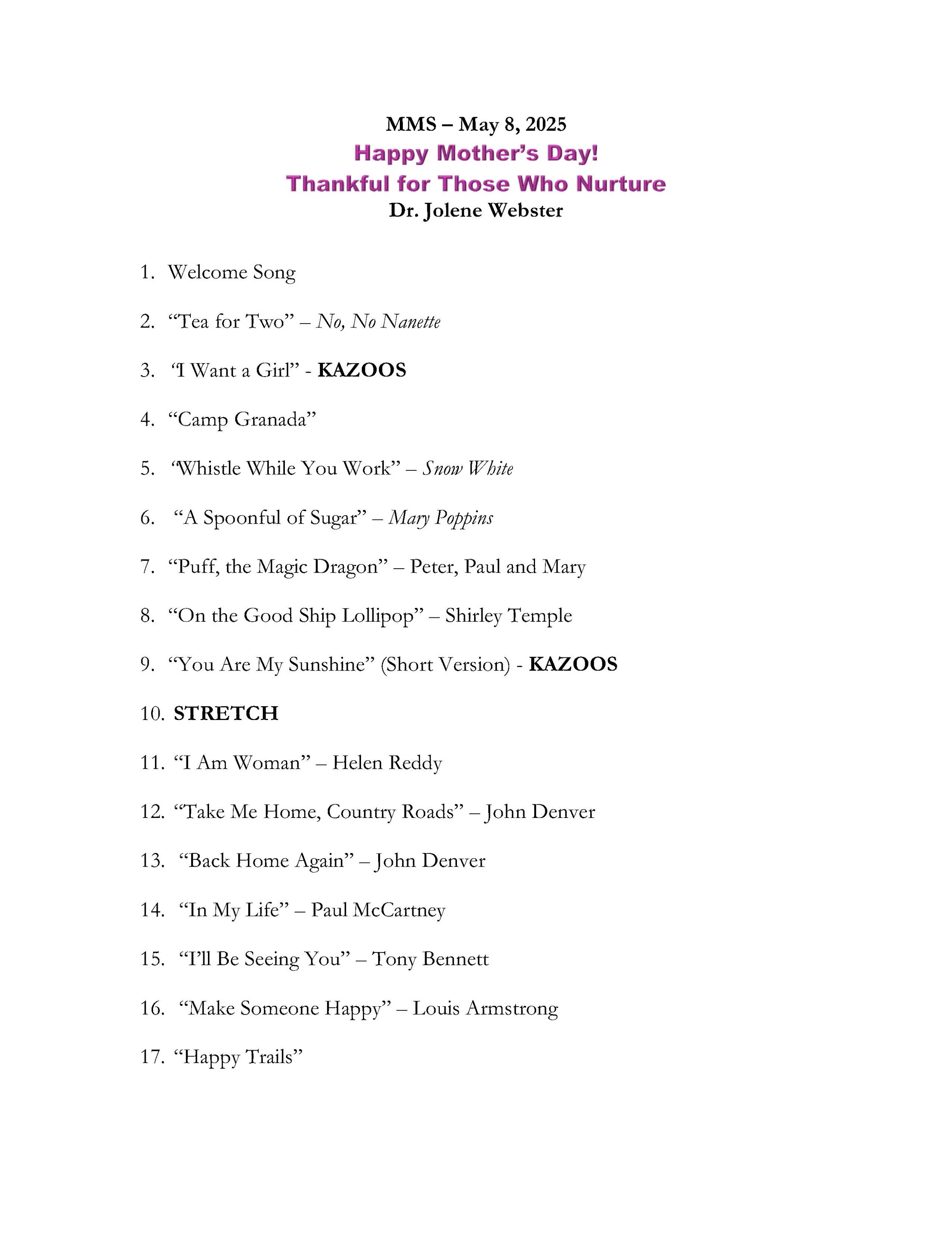 Song list for Mothers' Day, 5/8/2025