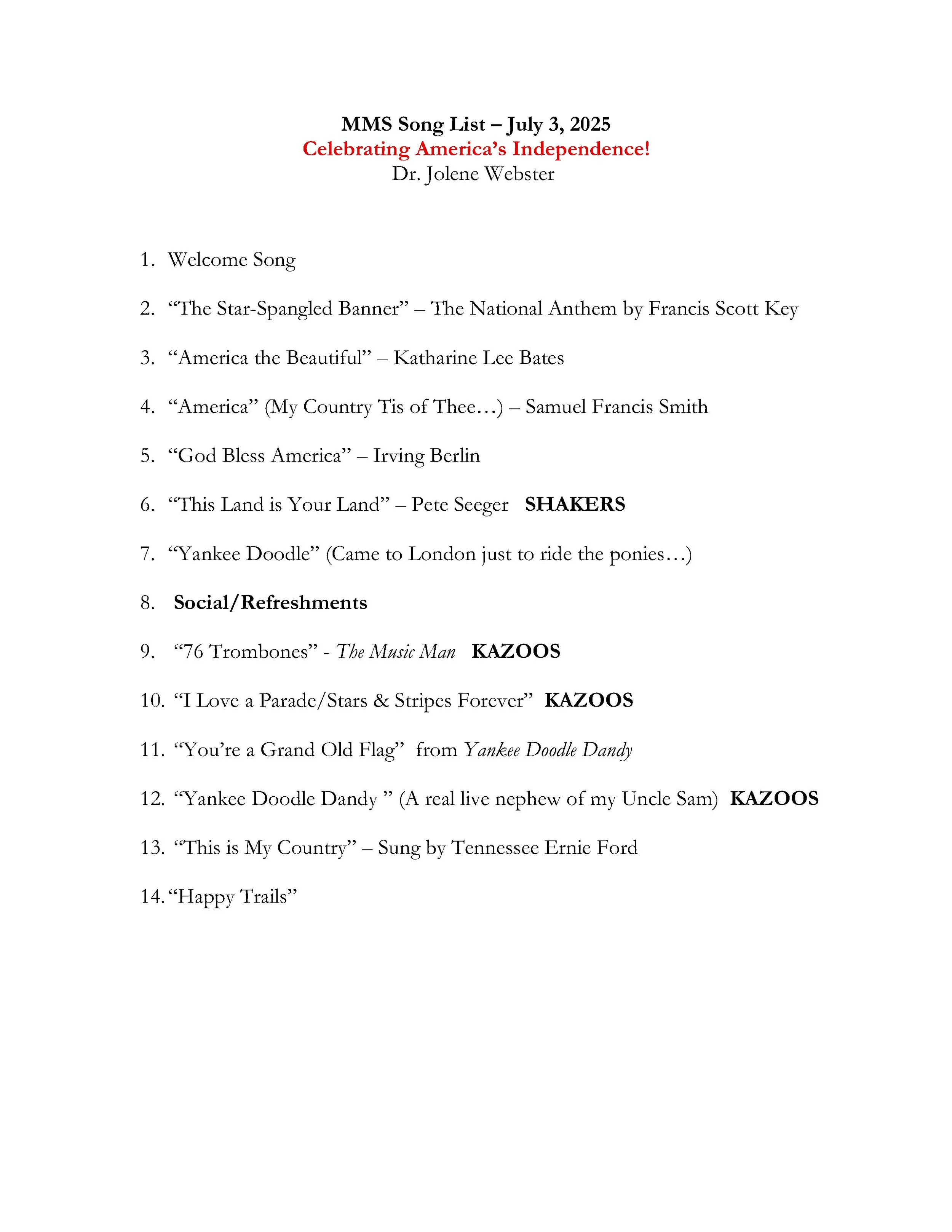 Independence Day Song List, 7/3/2025
